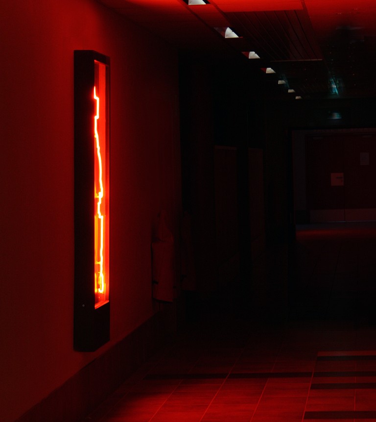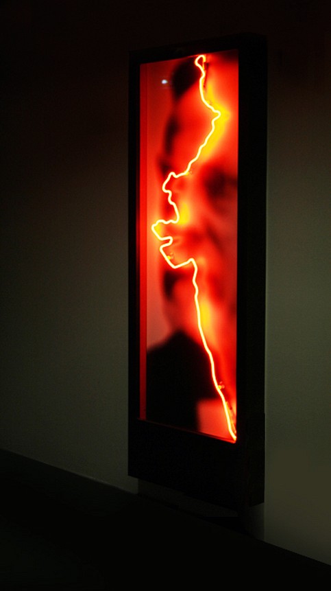 Pour ce travail, nous avons décidé de mettre en commun deux compétences : la pratique de l’art et la connaissance de l’espace avec l’artiste Mohamed El Baz. L’espace, qui sera inévitablement parcouru pendant plusieurs années par les collégiens, et l’art, qui, au cours de ce cycle scolaire, devra continuellement les interroger. Dès lors, c’est sous la forme d’un jeu de piste, dispersé dans l’ensemble du collège, que nous avons souhaité offrir des éléments de discussion et de réflexion aux élèves et à l’équipe pédagogique. De longues vitrines verticales renferment des néons dont la forme est issue de la carte du monde, «lumières territoires» et des profils de personnages emblématiques de la culture, «d’images connaissances».