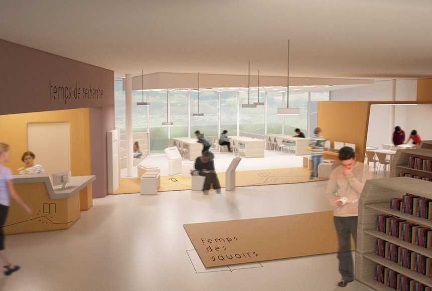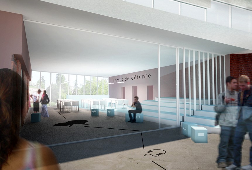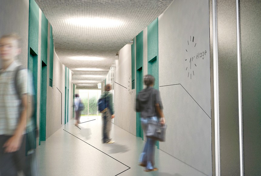L'aménagement intérieur est conçu dans la continuité architecturale. Il reprend des notions telles que le retournement, le soutènement et le paysage, propres au vocabulaire des fortifications. Il s'appuie également sur la notion de rythme scolaire en détournement la ligne de temps dans son design et sa signalétique.