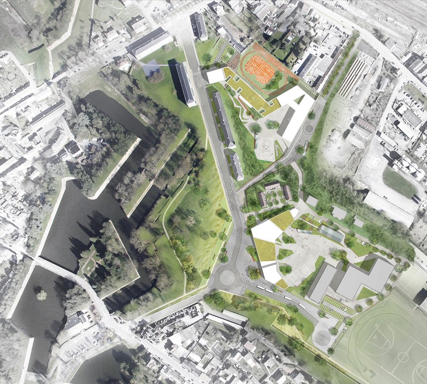 Le projet proposé crée un lien continu entre les différents bâtiments en les étirant sur l’étendue des parcelles et en s’inspirant des géométries anguleuses des fortifications dessinées par Vauban. C’est la forte structure des remparts ainsi que leur matérialité qui a guidé le parti pris architectural, ainsi que la gestion croisée des flux et du relief.