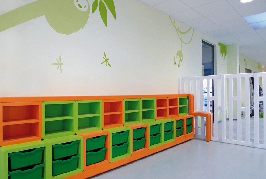 Une attention toute particulière a été accordée au mobilier. Ainsi, les meubles ont été spécialement conçus et réalisés pour la crèche favorisant leur utilisation par les tous petits. Le mobilier des zones de propreté intègre éviers, table à langer, rangements et dissimule les poubelles à couches. Les meubles des vestiaires intègrent quant à eux vide poche, portes manteaux et casiers individuels.