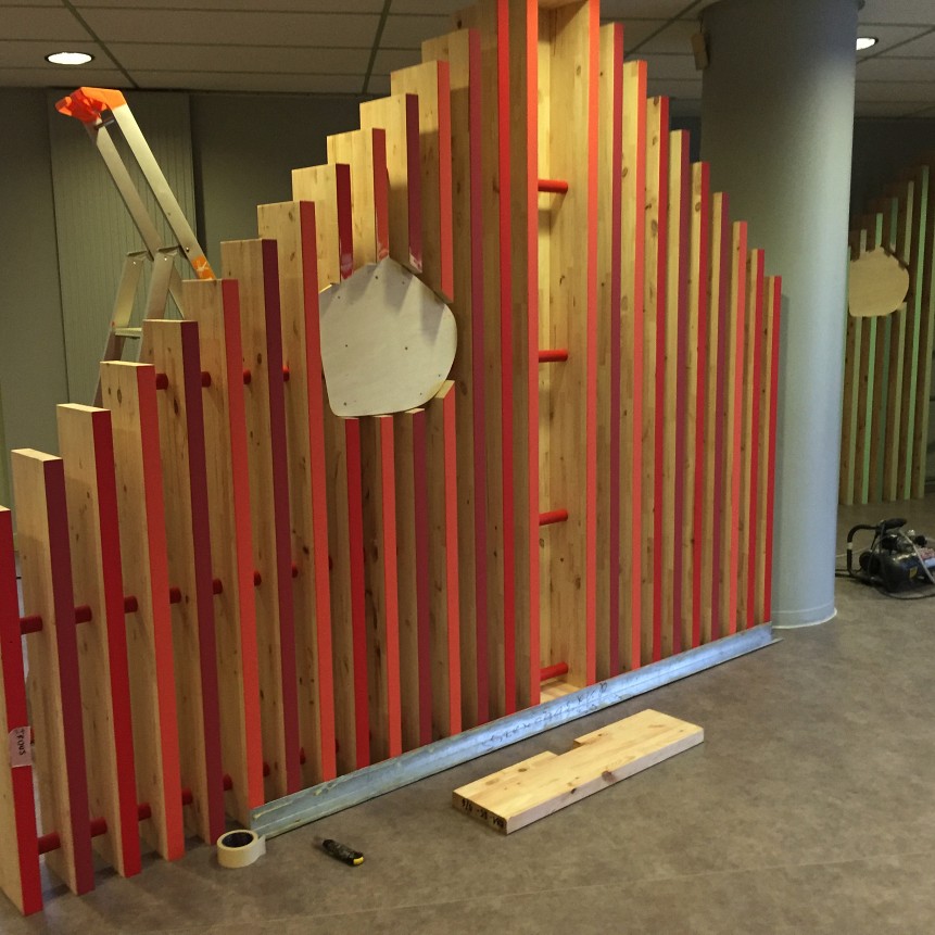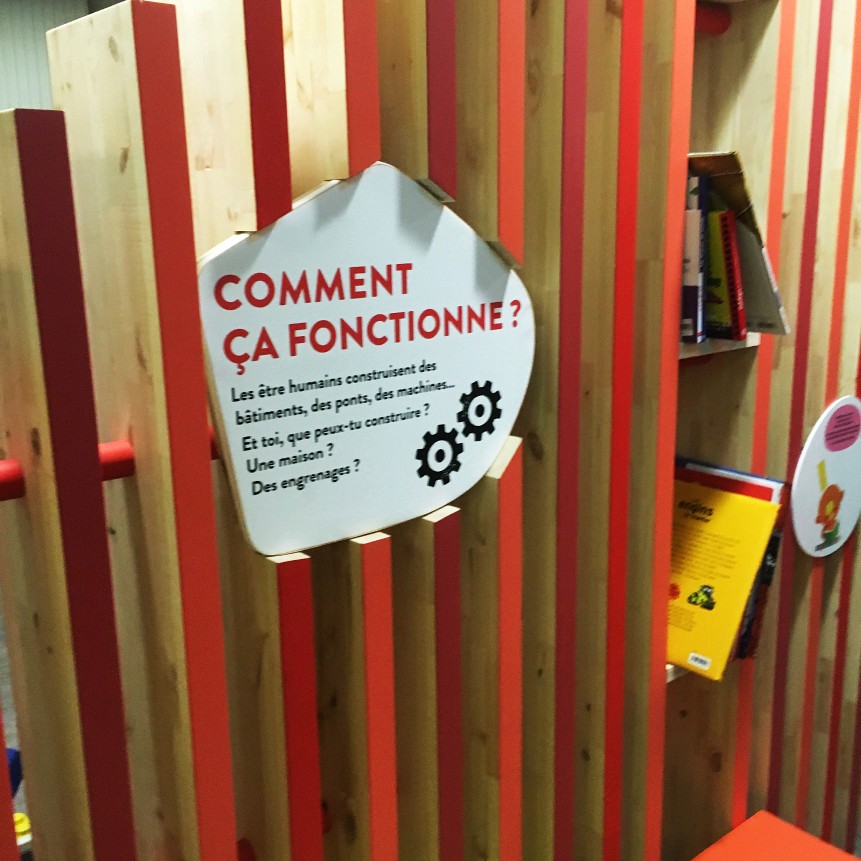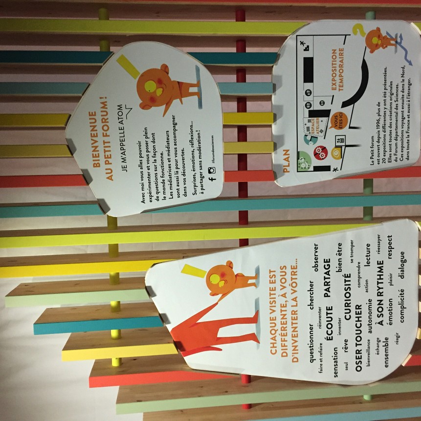 L’ensemble de cette réflexion a également été menée en lien étroit avec la graphiste et l’illustrateur, en réalisant des panneaux thématiques en bois rappelant la forme de la maison et recouverts de tissu. Ils présentent Atom, nouvelle mascotte du Forum, ainsi que les différentes consignes pour réaliser les manipulations. La couleur du texte s’adapte en fonction des teintes choisies pour chaque maison.
