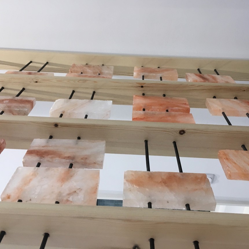L’ensemble de ces thèmes est séparé par de grands claustras de bois habillés de plaques de sel rose de l’Himalaya. Ce matériau , en plus de correspondre parfaitement à la thématique de l’exposition, a de grandes qualités esthétiques par ses nuances de couleurs et sa transparence pouvant rappeler celle du marbre.