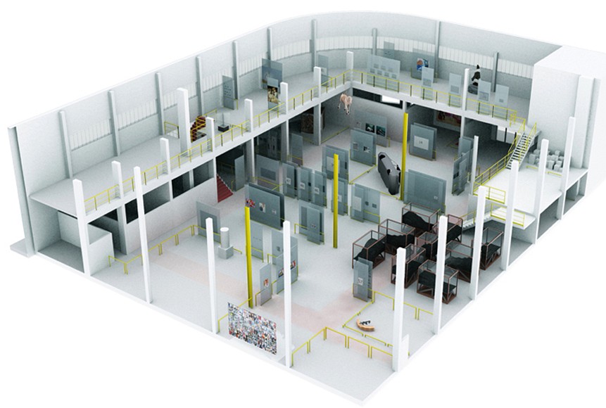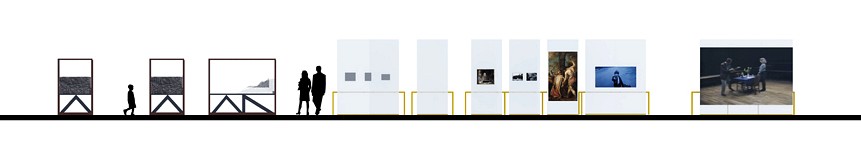 Notre choix s’est donc porté sur deux matériaux : le verre et le métal ; le verre, matériau préfabriqué et modulaire, sera support d’exposition ; le métal, matériau de référence industrielle, en sera la structure, mettra à distance les œuvres et guidera le visiteur.