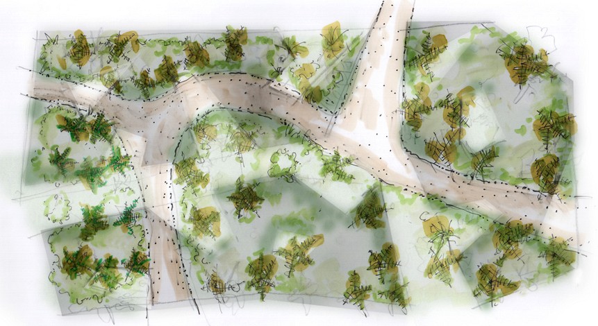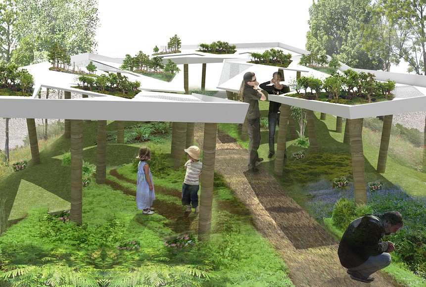 En réponse, nous avons choisi de proposer un jardin à deux niveaux de lecture : un sous bois grandeur nature et forêt miniature. Cette superposition d'échelles et d'univers propose ainsi une expérience nouvelle dans la perception de l’espace du jardin mêlant nature sauvage, micro-architecture et land art. Ce jardin secret tente aussi de faire prendre conscience au visiteur de l’importance de la biodiversité (du monde forestier entre autre) et de son incroyable fragilité. Les différences de niveaux nous entraînent dans une réflexion sur le rôle du jardin secret qui évolue au cours de la vie. En prenant un peu de hauteur et en sortant la tête des sous-bois on découvre une forêt de bonzaïs, solides et fragiles qui nous protège malgré l’ironie de leur échelle. En entrant dans ce monde miniature, la promenade continue, projetant en ce lieu souvenirs, rêves et imaginaires.