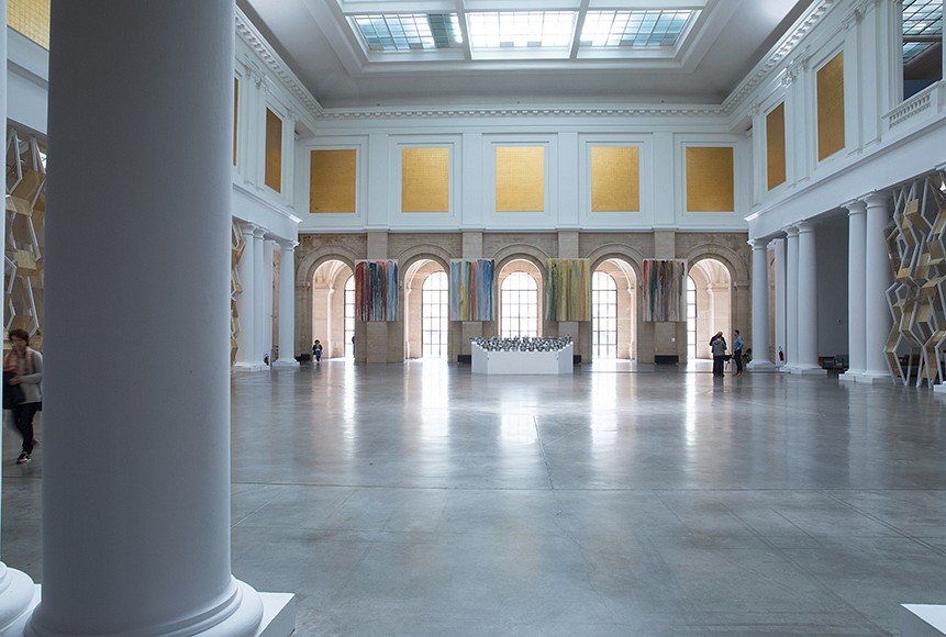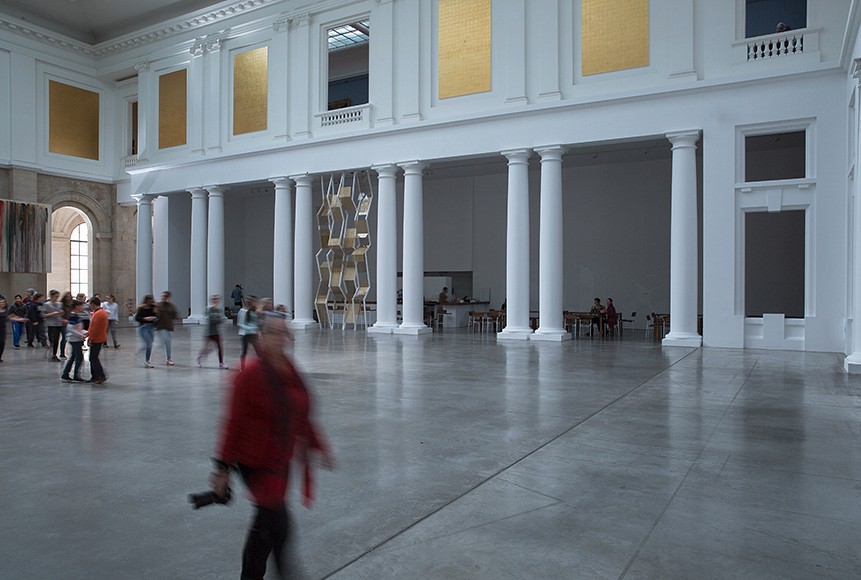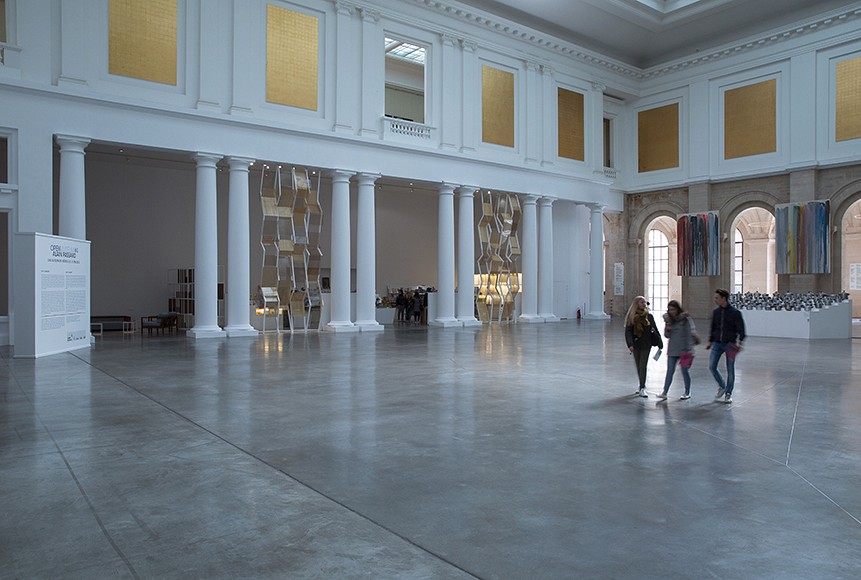 Le Palais, rénové il y a vingt ans par les architectes Jean-Marc Ibos et Myrto Vitart selon un parti-pris sobre et pure alliant subtilement le verre et le béton, fut récompensé du prix de l’Equerre d’Argent. L’atrium, par la monumentalité de son espace, 1 500 m2 pour une hauteur centrale de plus de 15 mètres, et la sobriété de son esthétique, espace central vide entouré d’un péristyle blanc surmonté de cadres dorés, rend toute intervention complexe. L’enjeu est de taille. La réponse aussi.