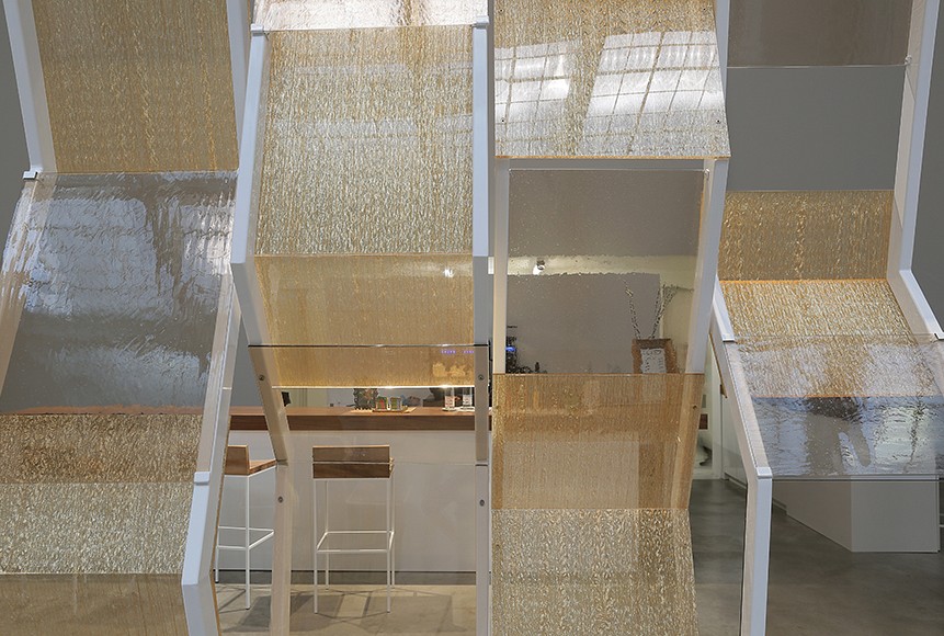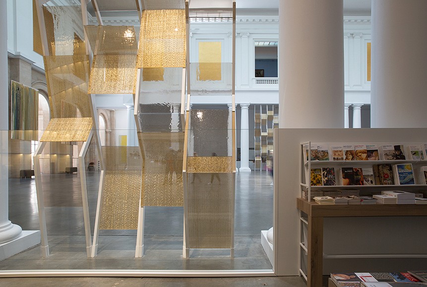 Ce choix des matières résulte d’une véritable innovation technique. Il s’agit pour l’une, de pièces de textile froissées formant par son relief de légères ondulations dorées, inscrites par inclusion dans une plaque d’acrylique, et pour l’autre, d’un tout nouveau verre dont les caractéristiques sont d’être, à la fois d’aspect antique et règlementairement Securit. Ce choix de matière, véritable prototype, n’est pas sans rappeler les œuvres déjà présentes au Palais ; le doré faisant écho aux reflets mordorés des cadres de l’atrium. La luminosité renvoie, quant à elle, au majestueux lustre d’entrée de Gaetano Pesce. La lumière du lieu conçue par Jacky Lautem, selon un concept de mise en lumière crépusculaire, permet à celle-ci de se moduler en fonction de la lumière du jour et donner au lieu un éclat naturel.