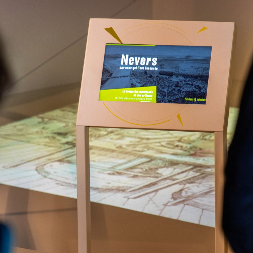 Supports divers ; textes, illustrations, éléments graphiques, interfaces numériques qui peuvent évoluer au cours du temps. Un CIAP a pour vocation de s’adapter aux transformations du territoire, aux évolutions des matériaux et moyens de mise en œuvre. C’est un lieu de partage de connaissances, d’échanges, où touristes et habitants peuvent trouver à chaque nouvelle visite un contenu révélé. Les grands principes scénographiques reposent sur un élément central «l’échelle» autour de laquelle se décline des typologies répondant aux besoins des contenus scientifiques, de médiation et des multimédias. Des modules, cimaises, lutrins complètent l’ensemble scénographique. Les thématiques développées dans le CIAP se concentrent sur les ressources naturelles de Nevers avec comme fil conducteur la Loire, les émotions, la protection de l’environnement, une matériauthèque et des focus sur l’architecture et la conscience patrimoniale. La sobriété de l’échelle permet de révéler et de valoriser les murs et la tourelle du Palais. Sa finesse permet de voir la plupart des murs existants.